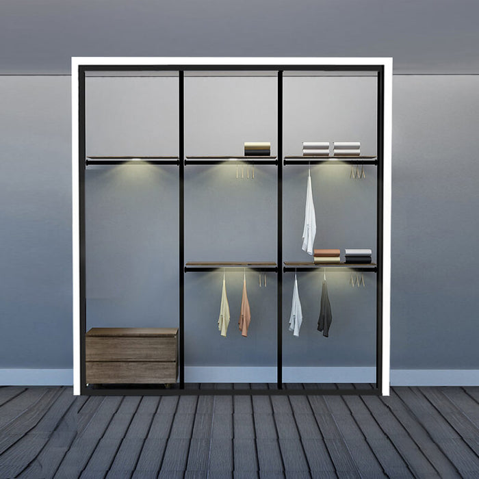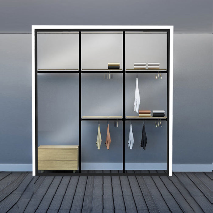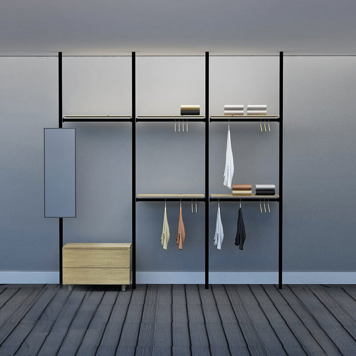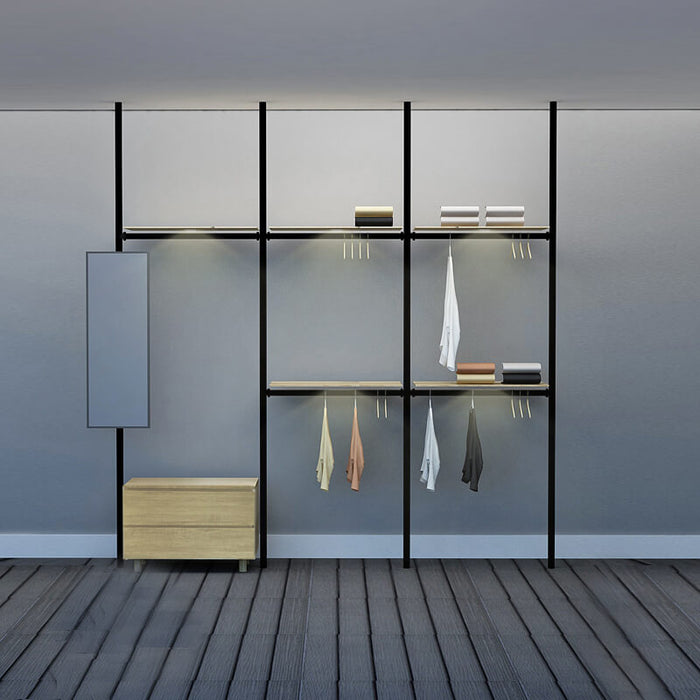 Excel's solution is this modular wardrobe where you can custom build your very own storage space. By picking from a wide range of compartments, you can create your own wardrobe system to accommodate your space limitations