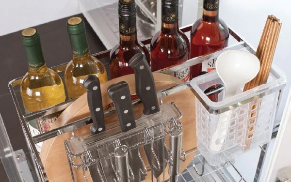 - Accommodates various kitchen items such as chopping board, seasoning bottle and cutleries