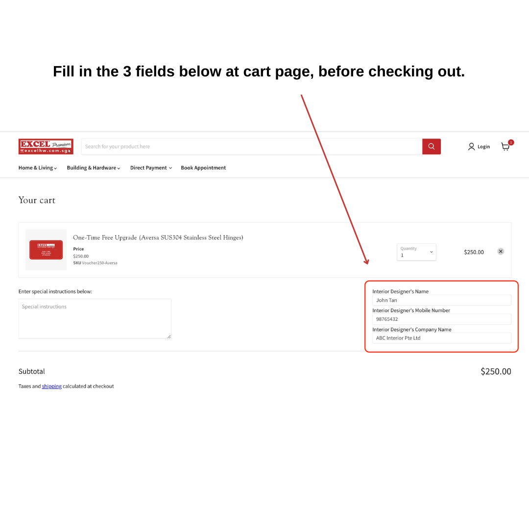 • The Name of the agent that informed you/you are liaising with from the Interior Design firm (eg. John Tan)