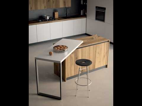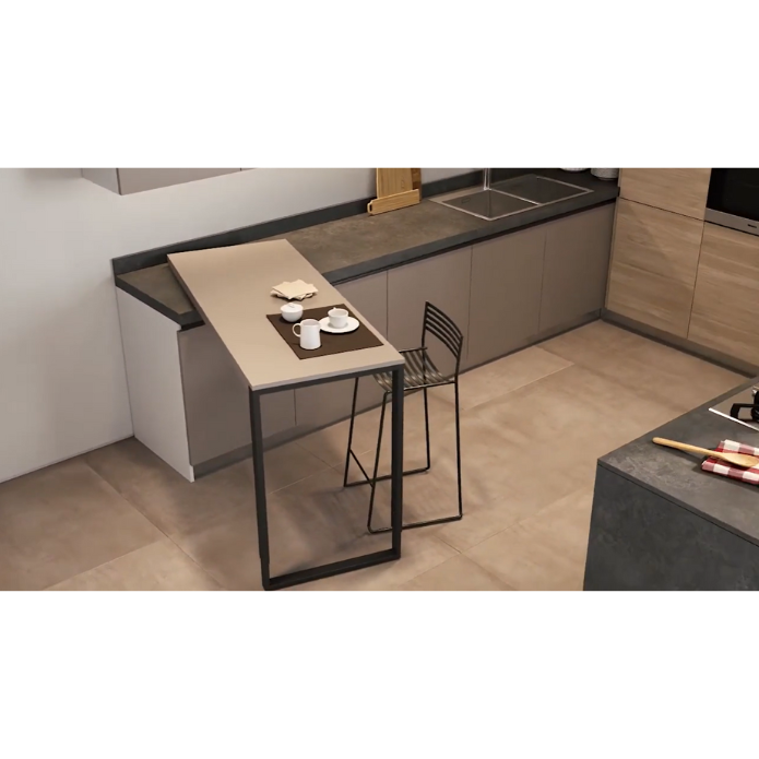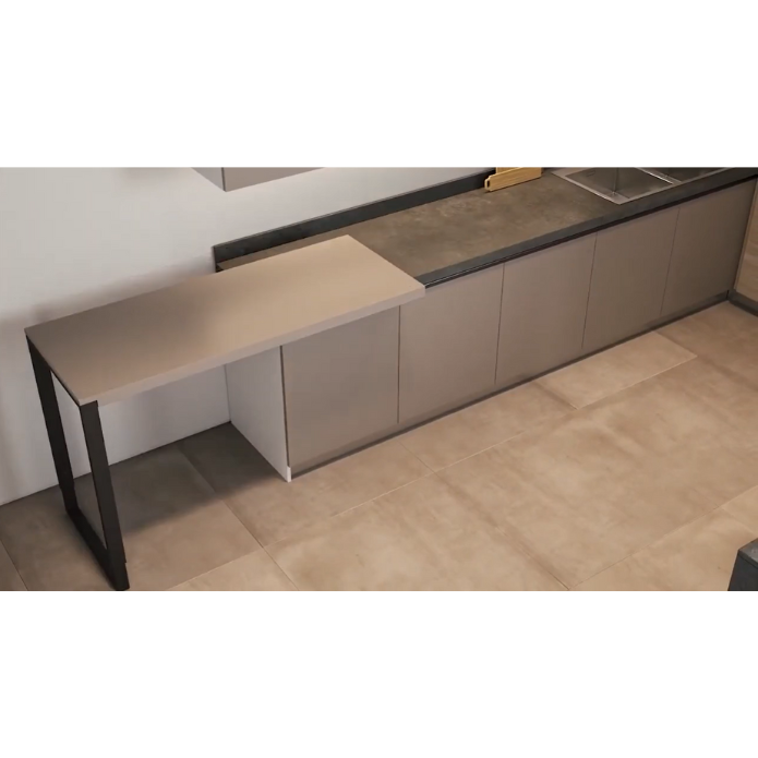 Sestante is a sliding and revolving top with double legs, which give the mechanism strength, stability and a high load capacity (80 kg). Applied either on a kitchen island or a linear kitchen, the table remains on the top of the cabinet, covering its surface when closed. Whenever necessary, it is possible to turn and rotate Sestante over 180° and turn it into a versatile worktop to prepare meals, to keep children nearby while doing homework, or to seat more people at the table during dinner, not to mention the many possible applications on living room and office environments. Sestante is a multifunctional mechanism for multitasking and ingenious people.