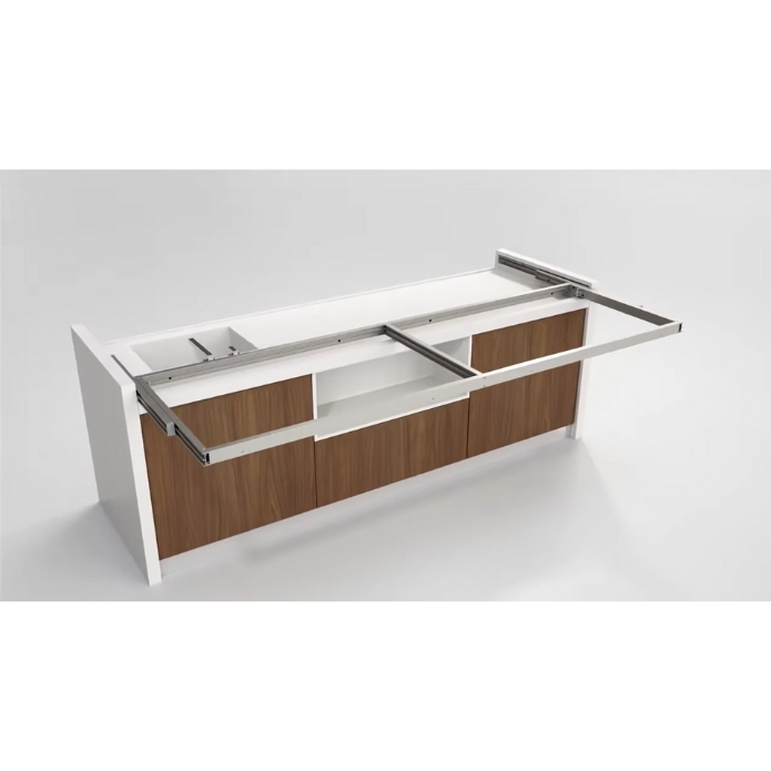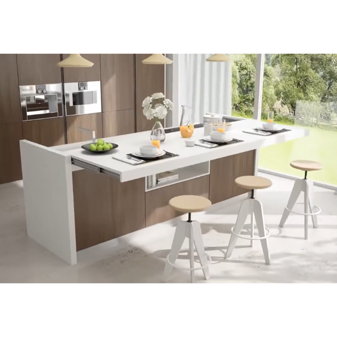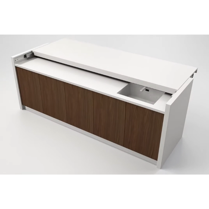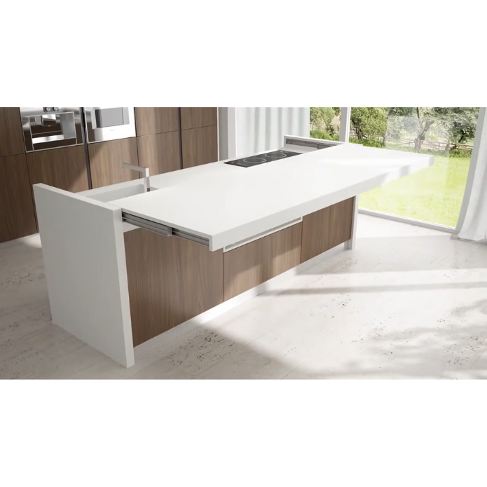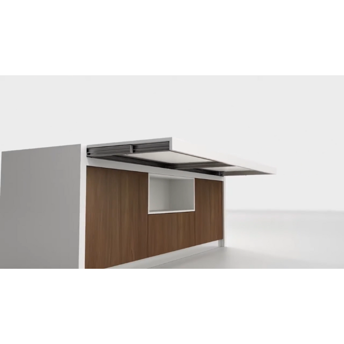 Snack is a sliding counter that revolutionizes the way of using the kitchen block. Thanks to the system of aluminum guides it is possible to conceal the worktop (possibly also composed of burners, sink, etc.) giving the kitchen a clean and modern design. The guide, partially recessed in the lateral and under the top, allows you to open the top thus taking advantage of a comfortable extra surface or snack table. Soft Move Version: Special version with electrified sliding system. A single click on the remote control is enough to extract the peninsula.